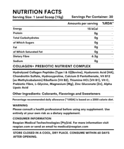 Reapian Medical Collagen+ with Prebiotic Fibre is formulated with the most scientifically researched ingredients to effectively help combat the signs of ageing. Combining hydrolyzed collagen peptides (Type I & II), Hyaluronic Acid (nature’s connective tissue moisturizer), Chondroitin Sulfate (for joint and cartilage health), Zinc (the skin mineral), Alpha Lipoic Acid, Magnesium, Vit C, and Vit B12 for optimum connective tissue health and hydration. Reduce wrinkles and fine lines, dry lips, and strengthen hair, nails, and joints. It may help to reduce the appearance of cellulite.